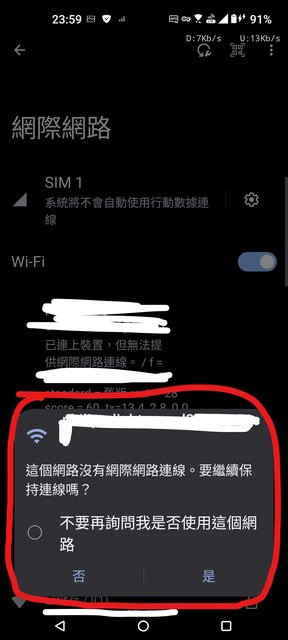 (如果不慎點到「否」則會直接斷線,即使再次手動連上該WiFi也會拒絕所有流量