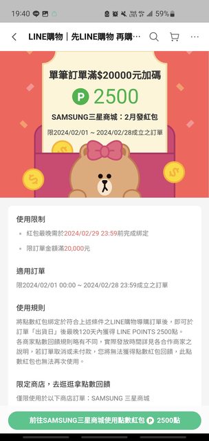 推 bloody089 : 開使用規則,E大用的2000沒法回饋LINE POINT,所以 02/03 21:25