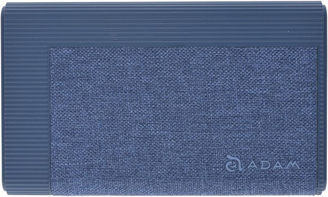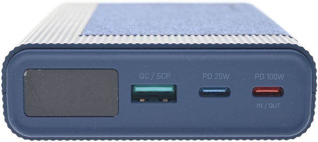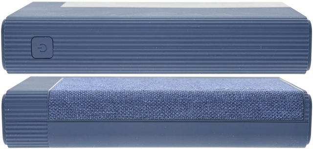 ▼行動電源外殼具備止滑條紋,正面部分區域採用布面材質,角落有商標