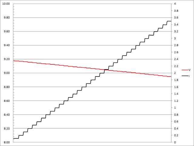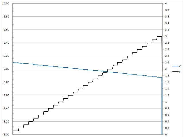 ▼USB-A的9V輸出負載測試,隨著電流增加,輸出電壓下降,輸出電流超過3A截止