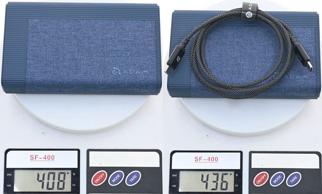 ▼行動電源重量408克,行動電源加充電線重量436克