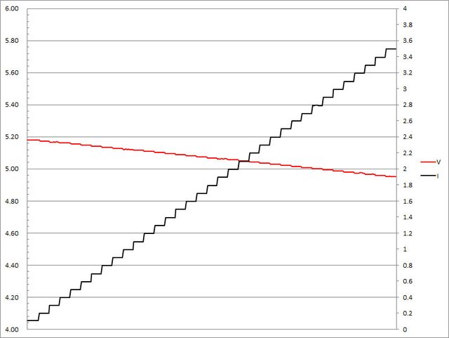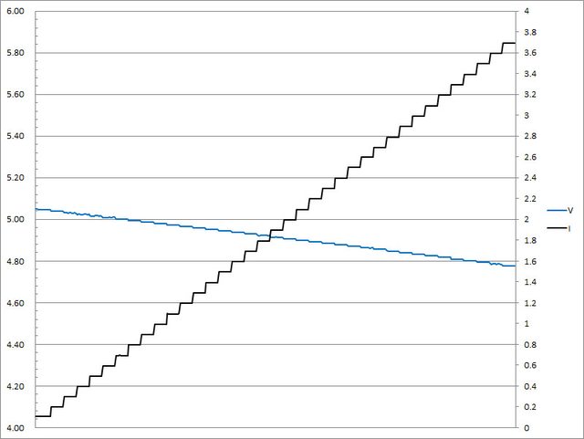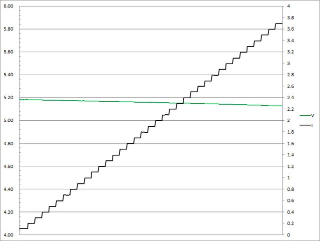 ▼USB-A的5V輸出負載測試,隨著電流增加,輸出電壓下降,輸出電流超過3.7A截止