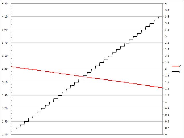 ▼USB-C2的第二組PPS檔3.3V輸出負載測試,隨著電流增加,輸出電壓下降,輸出電流超
