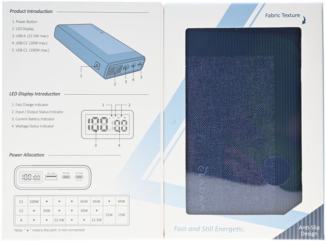 ▼打開外盒正面活動頁,左邊有行動電源介紹、LED顯示幕介紹、輸出埠/功率分配。右邊