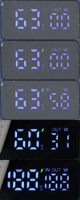 充時會顯示綠色閃電,異常時(例如溫度過高或輸出過載)會全部點亮並閃爍