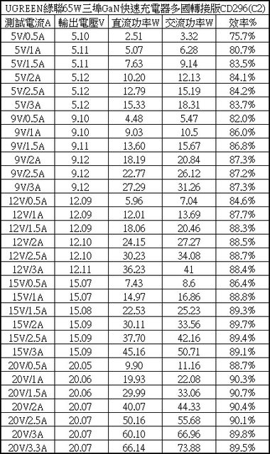 ▼USB-C2單獨使用下各組輸出轉換效率表,整體輸出轉換效率在75.7%至90.7%之間