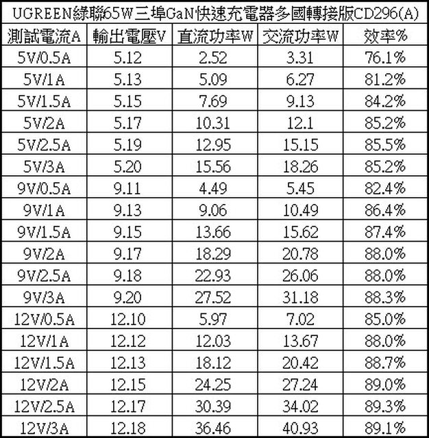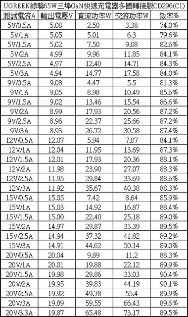 ▼USB-C1單獨使用下各組輸出轉換效率表,整體輸出轉換效率在74%至90.4%之間