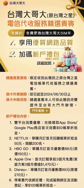 推 lackingg : 我也有收到簡訊,想請問換成台灣大哥大的sim卡跟原 04/20 14:01