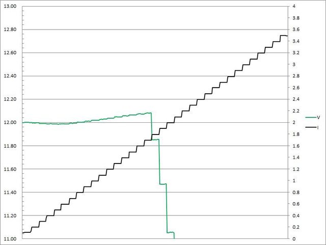 ▼USB-A的12V輸出負載測試,隨著電流增加,輸出電壓上升,輸出電流超過1.7A大幅壓降