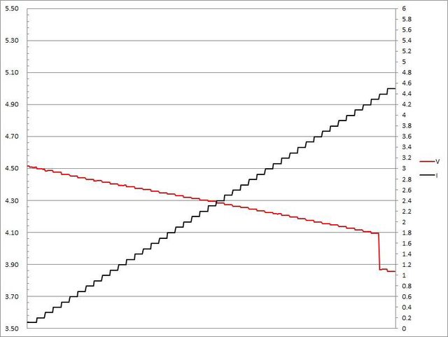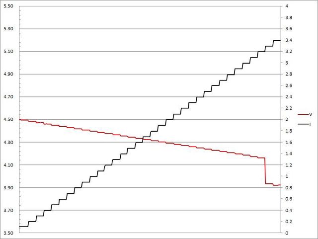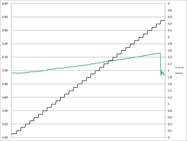 ▼USB-A的5V輸出負載測試,隨著電流增加,輸出電壓上升,輸出電流超過3.4A壓降,超