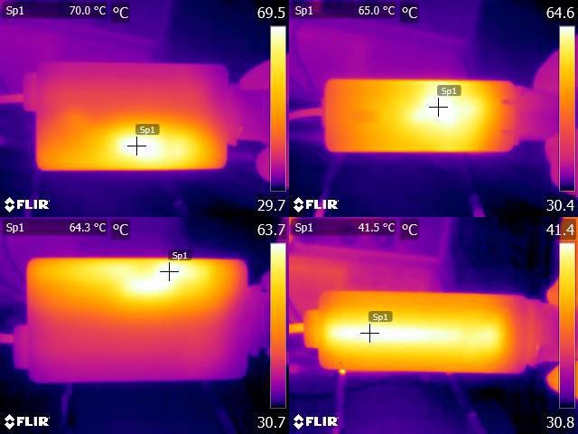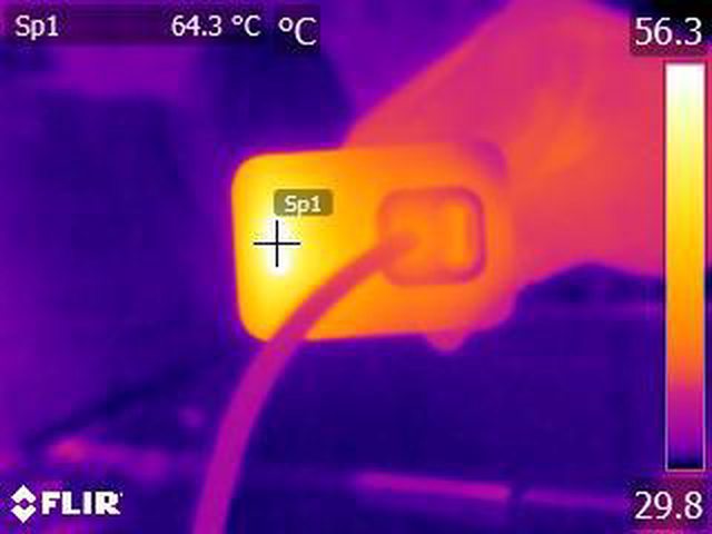 ▼充電器模式下於電池完全充飽時直出線連續輸出20V/1.5A一小時後連接埠的紅外線熱影