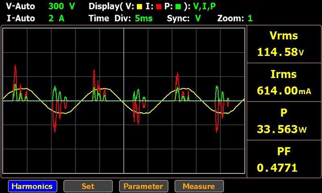 ▼充電器模式下於電池完全充飽時直出線輸出20V/1.5A的交流電壓/電流/功率波形