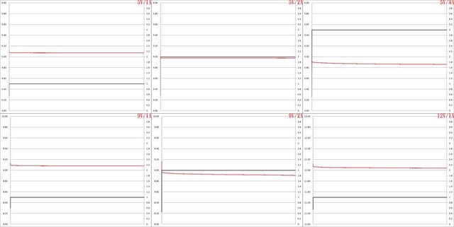 ▼行動電源模式5V/1A、5V/2A、5V/3A、9V/1A、9V/2A、12V/1A放電的電壓電流圖表如下