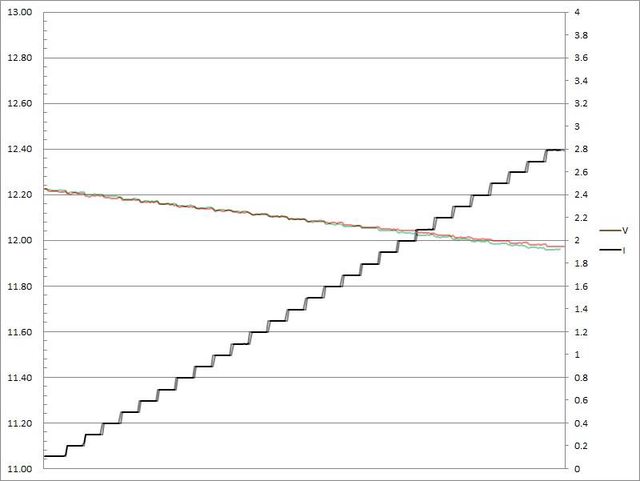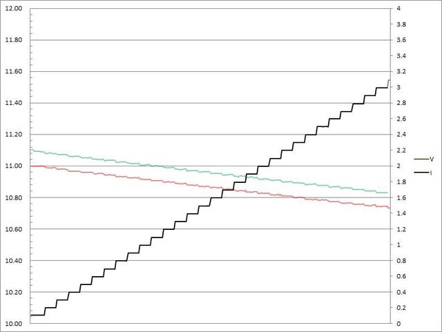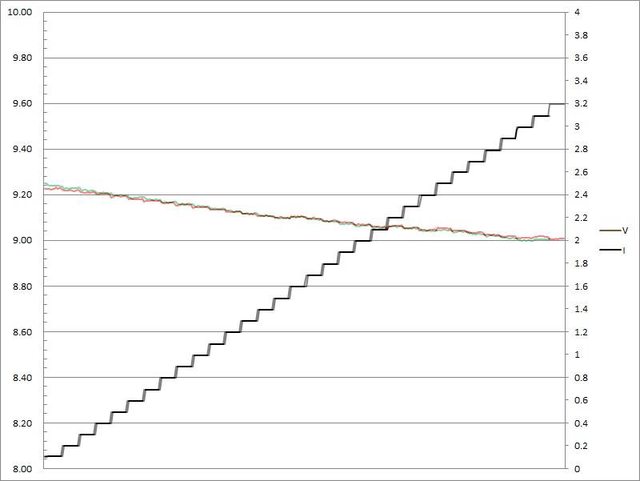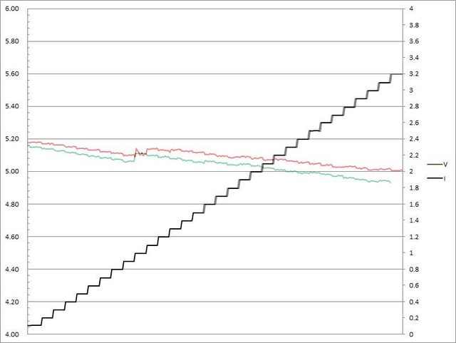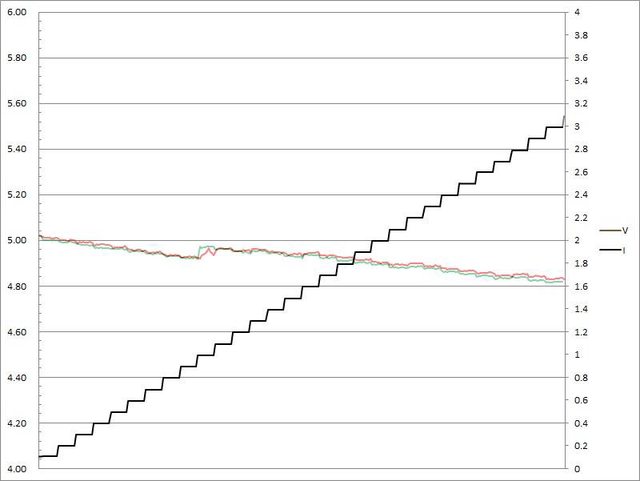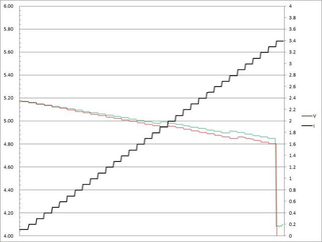 電壓下降,輸出電流超過3.3A大幅壓降,超過3.4A截止