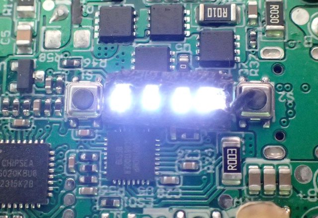 ▼4個白光LED指示燈周圍有遮光罩,避免漏光