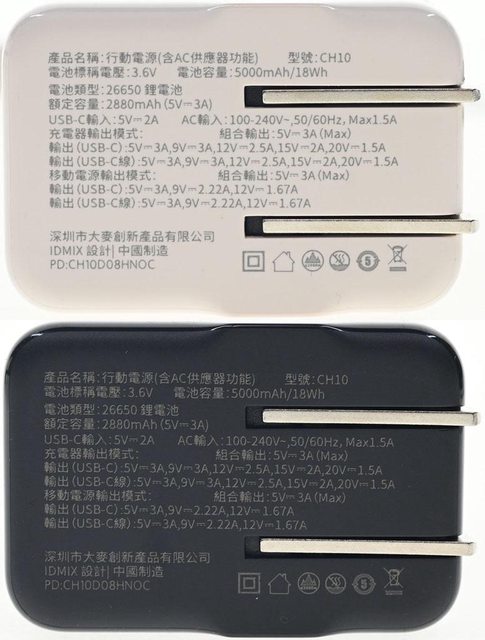▼米白版(左)與黑色版(右)IDMIX MR CHARGER CH10 Chill豆腐 30W雙模行動電源底部印