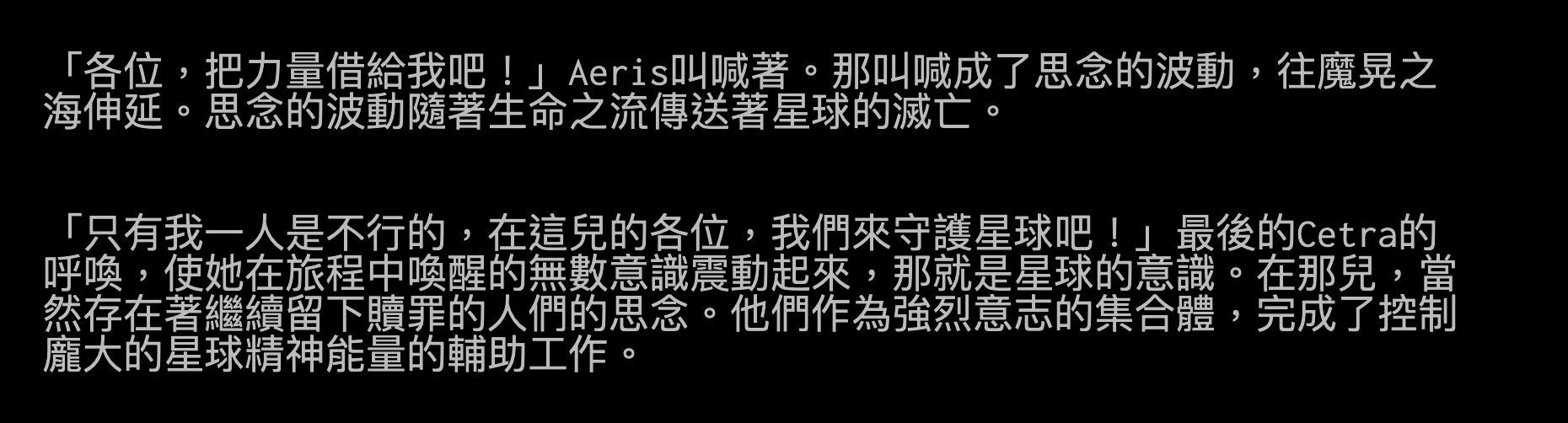 bego487: 救世界的過程 但FF7後續的衍生作品又擴大解釋生命之流 如 04/16 09:50