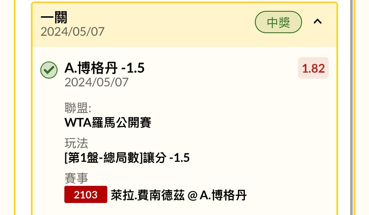 Internazionali BNL d'Italia 羅馬公開賽 ATP1000大師 WTA1000巡迴 WTA 1000 / R128 2103 23:10* 58' 45' (ROU) A.Bogdan 6 6 12 (CAN) L.Fernandez* 4 1 5 2071 費- 博+ 客12.5 主11.5 不讓  1.42  2.20 2:0 1.90 3.30 2:1 3.40 4.55 盤數 2/1.40 3/2.20 20.5 大1.56 小1.94 S1正比 21.5 1.72 1.78 6:0 22.00 0:6 49.00 22.5 1.92 1.58 6:1 8.25 1:6 16.00 大 1.92 1.70 6:2 5.80 2:6 9.75 小 1.58 1.80 6:3 4.80 3:6 7.00 總局 單1.76 雙1.74 6:4 4.90 4:6 6.25 2.5 1.60 1.90 7:5 10.25 5:7 13.75 3.5 1.78 1.72 7:6 9.75 6:7 11.50 4.5 2.07 1.46 S1 PK 1.46 2.05 S1/全場 9.5 大1.86 小1.58 費費 1.55 博費 5.75 1.5 1.62 1.82 費博 7.75 博博 2.45 -- ※ 發信站: 批踢踢實業坊(ptt-site.org.tw), 來自: 36.232.141.104 (臺灣) ※ 文章網址: https://ptt-site.org.tw/SportLottery/M.1715093042.A.BE4