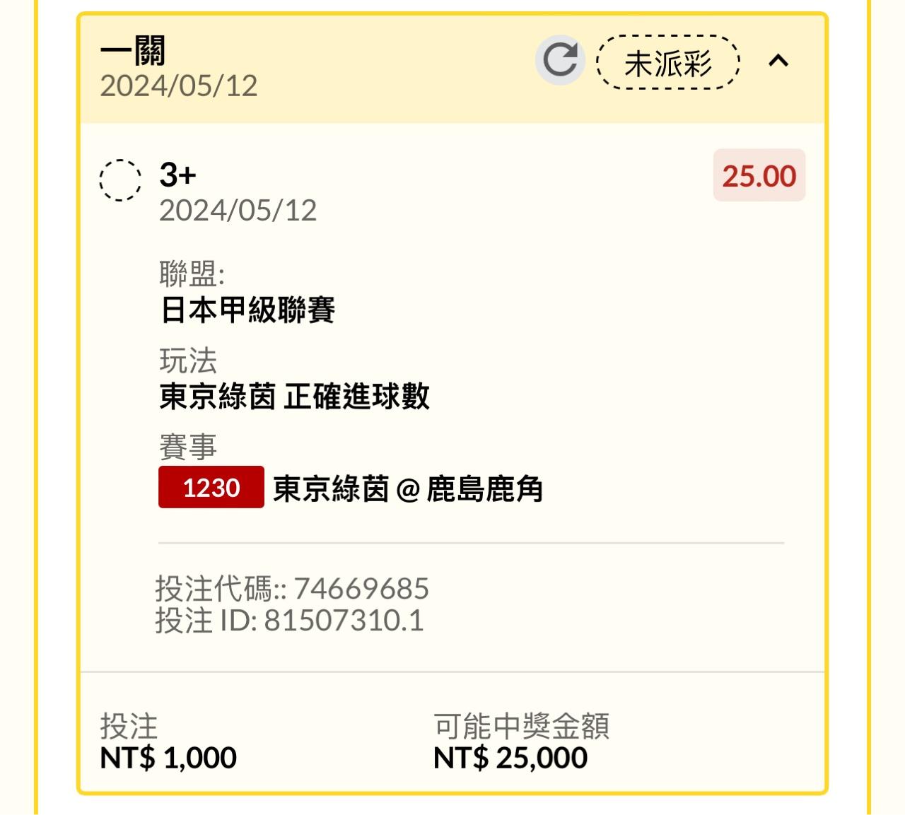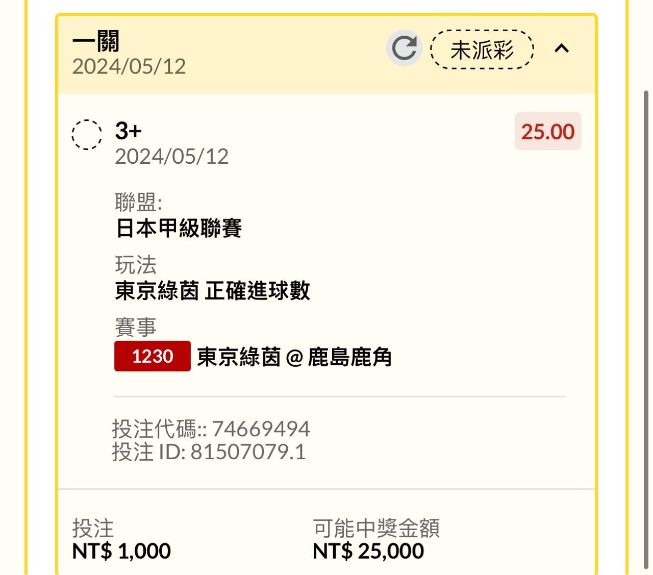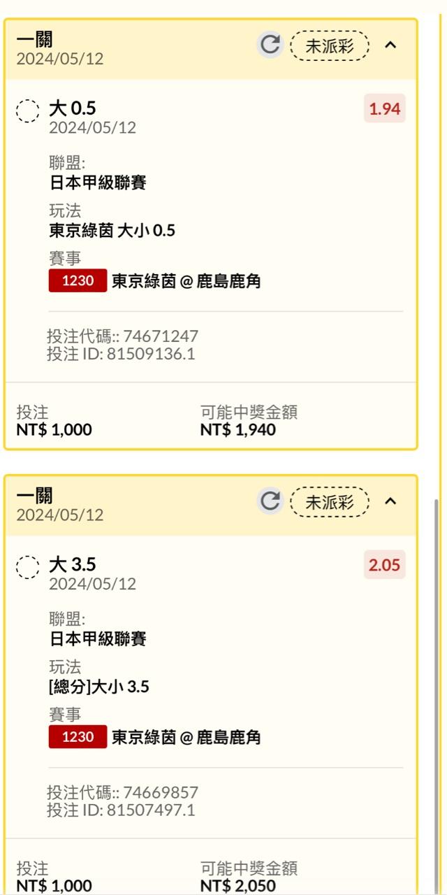 → ChiaRen0823: 我賽前買中場22 80倍 終場33 104倍 1.200.47.20 05/12 14:01