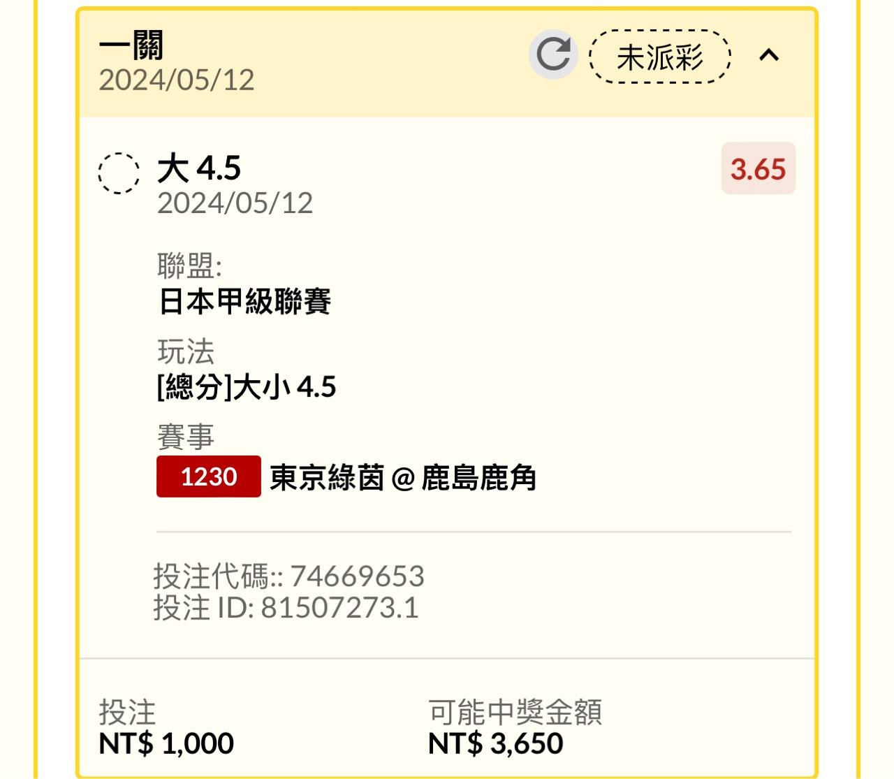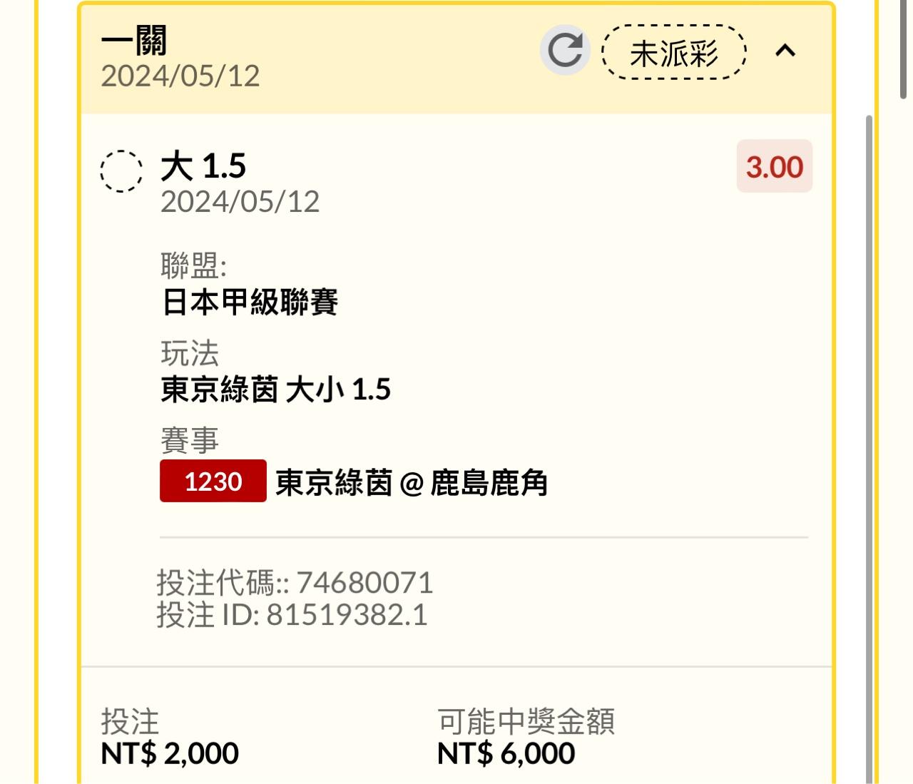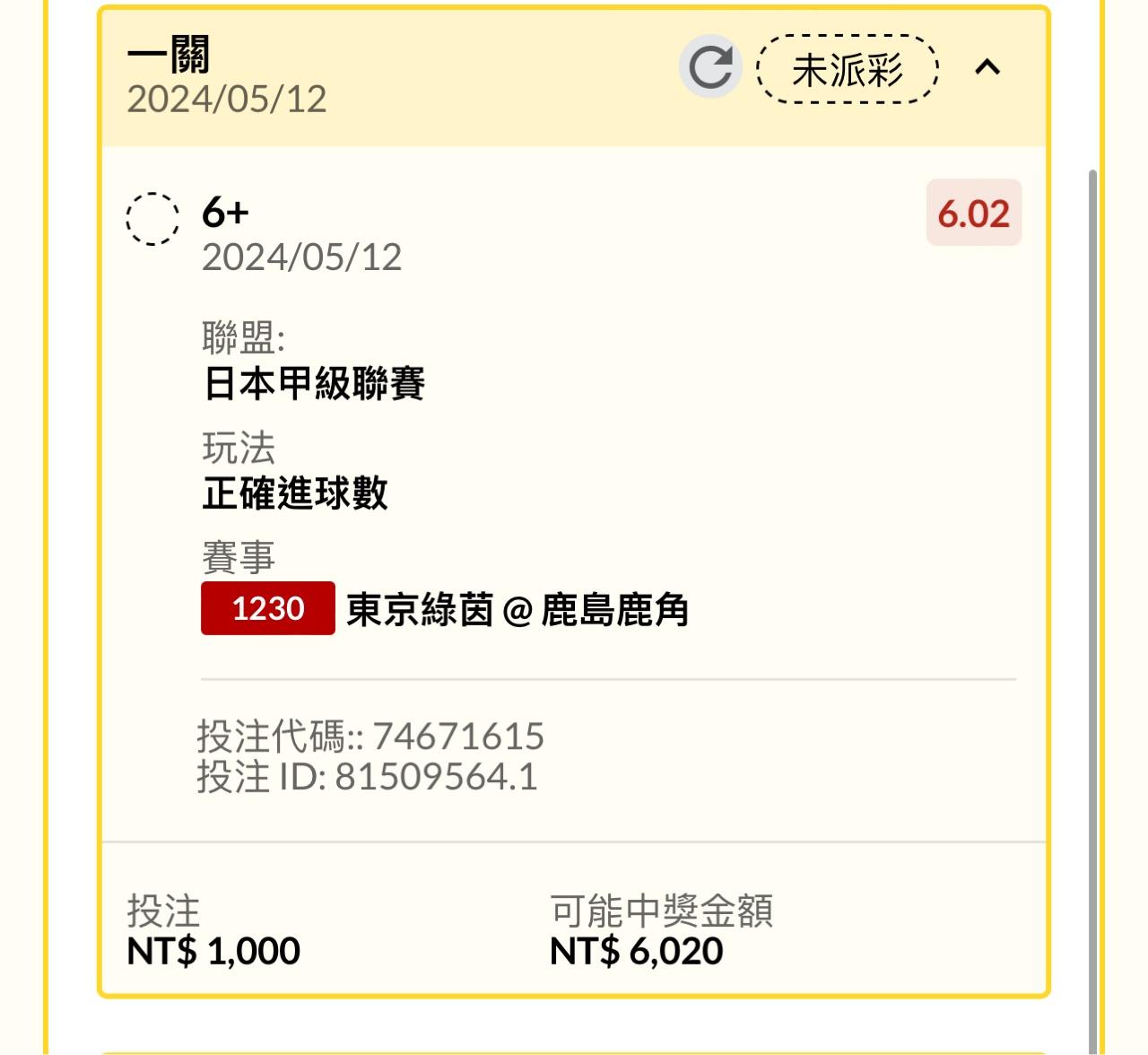 → ChiaRen0823: 我賽前買中場22 80倍 終場33 104倍 1.200.47.20 05/12 14:01