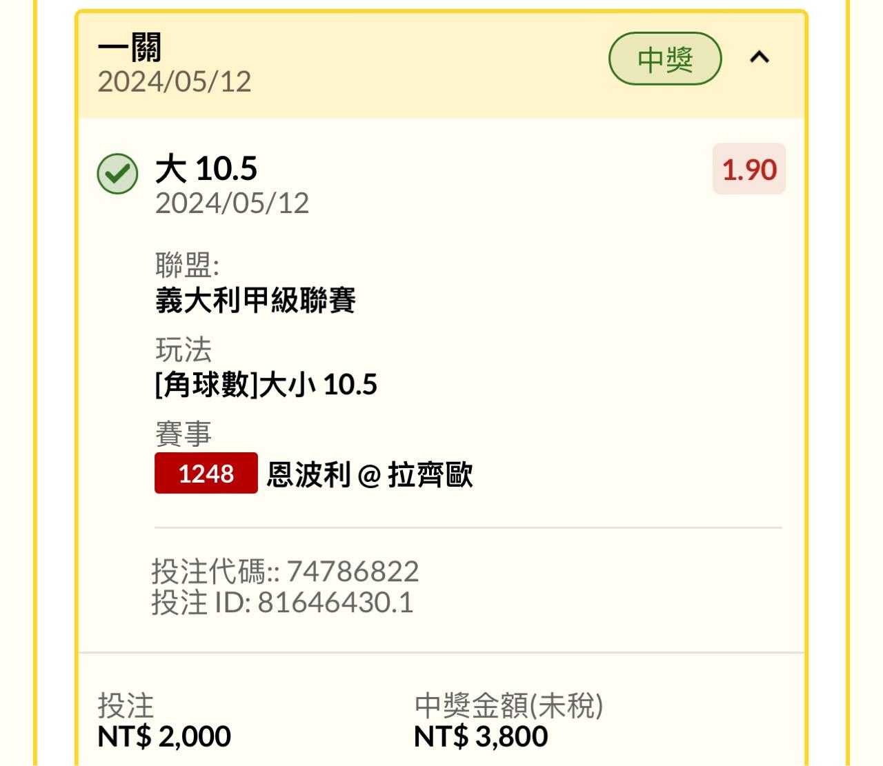→ kidlan789: 意甲小分還真挺穩的 114.43.42.129 05/12 18:47