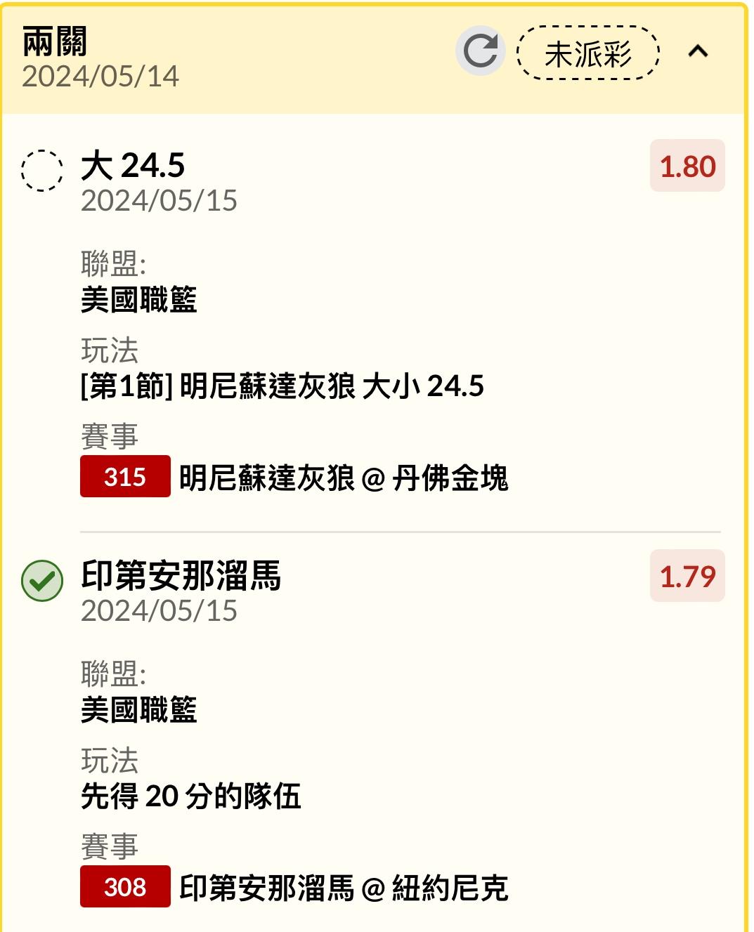 → michael71230: 尼克26+,19.5倍 27.53.114.33 05/15 10:41