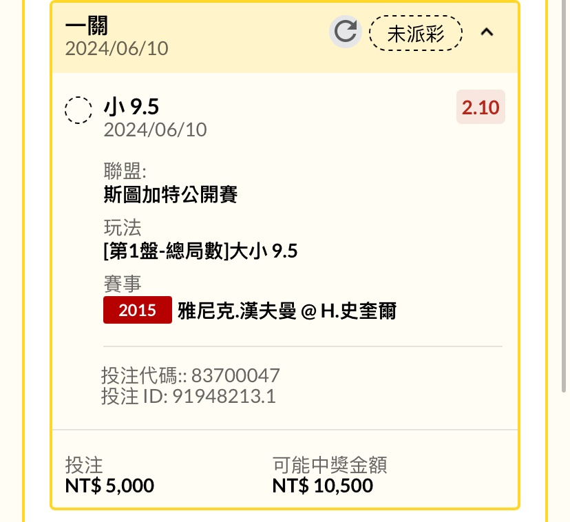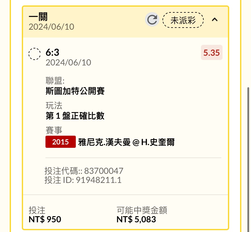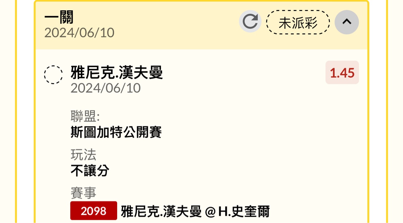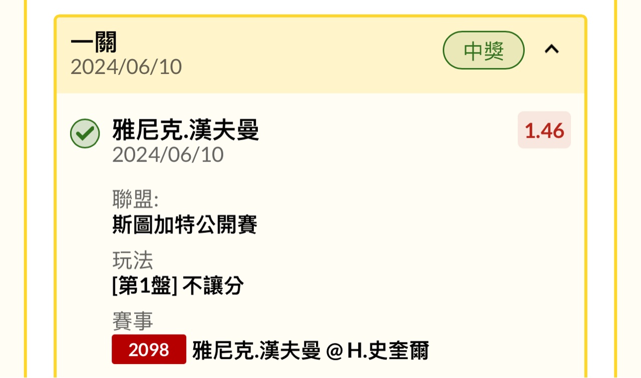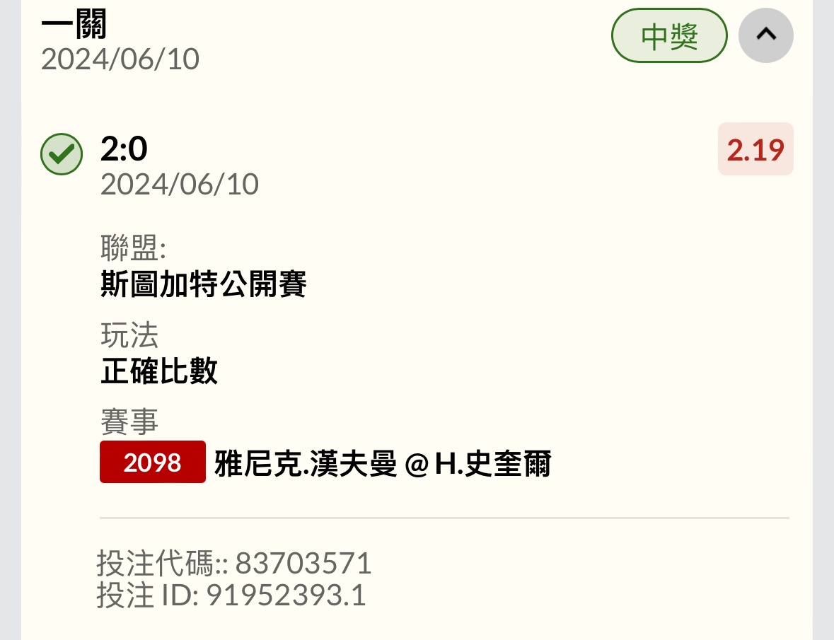 → simonangel: 謝謝史奎爾 這場3張都收 第一盤客1.45 59.115.66.95 06/10 23:05