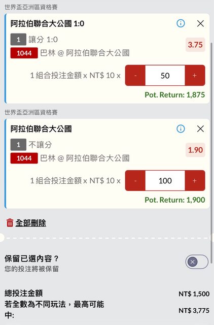 讓分 1:0 阿拉伯聯合大公國 3.75