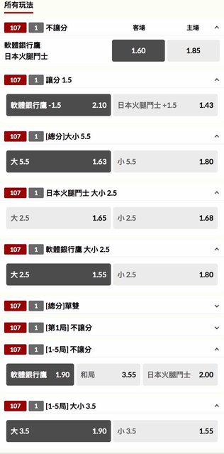 說明:看好軟銀勝,日棒賠率就真的要自己找時間進去了,我基本上都挑高賠。