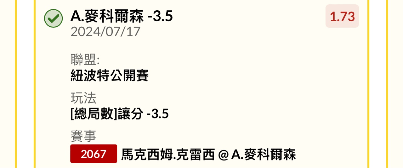 推 w2658741: -1.5 有2.40高賠 111.71.215.137 07/18 00:46