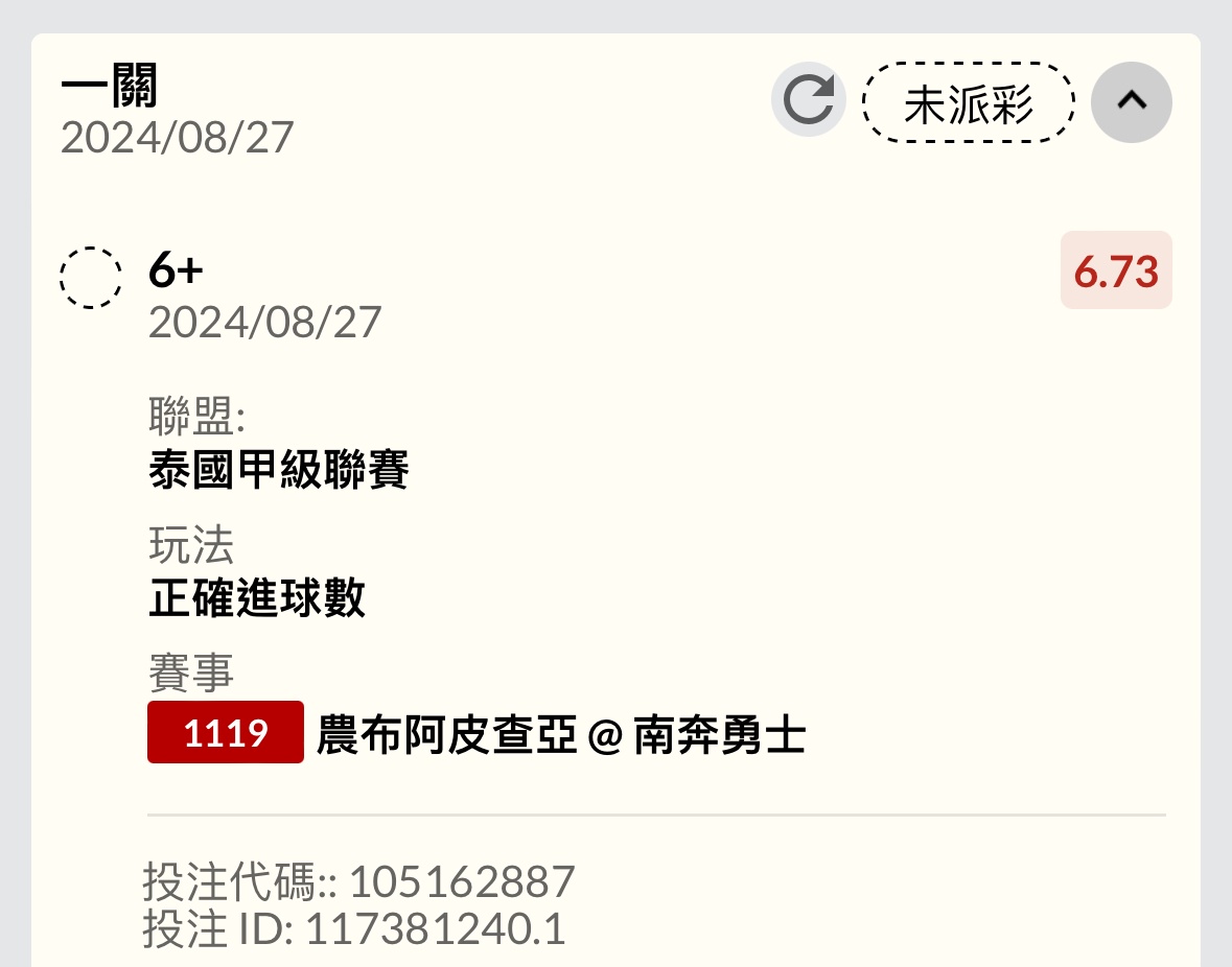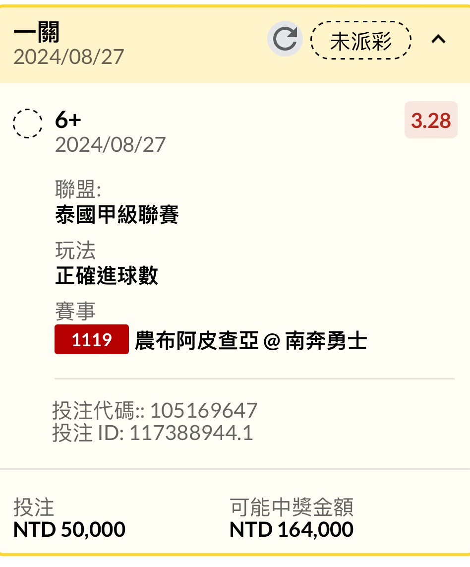 → ty7788665: 可惜剛剛買6+ 7倍時被進球 剩下3倍106.1.217.229 08/27 20:38