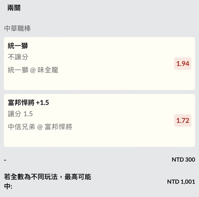 統一難得開不讓高賠1.94,看好血郭;富邦受讓1.72很甜,相信象魔力被打爆。