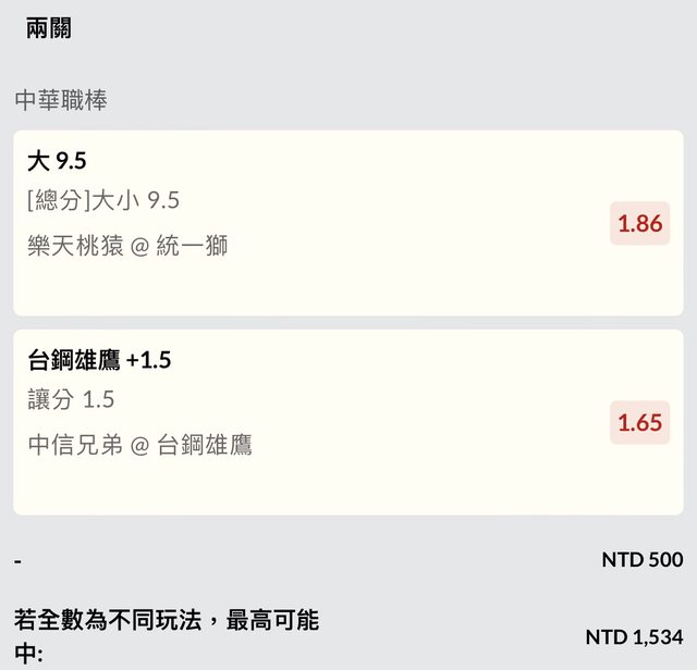 早上MLB串關被洋基單隊大分搞掉,晚上中職繼續衝,統一樂天今晚感覺一副想開大分,