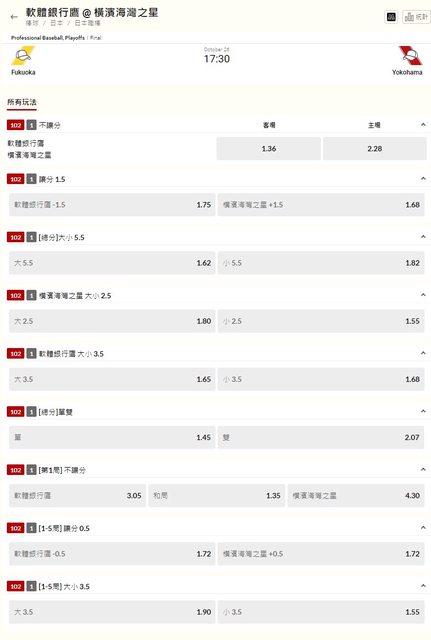 推 Wayne121: 軟銀1-5局讓0.5分1.72 101.3.149.192 10/26 16:53