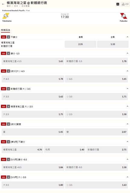 推 peter5140: 1-5局 軟銀pk 1.58 180.217.40.37 10/29 15:57