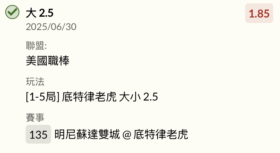 推 berthuang: 賽前老虎1-5局2.5大 1.82 106.64.174.78 06/30 08:31
