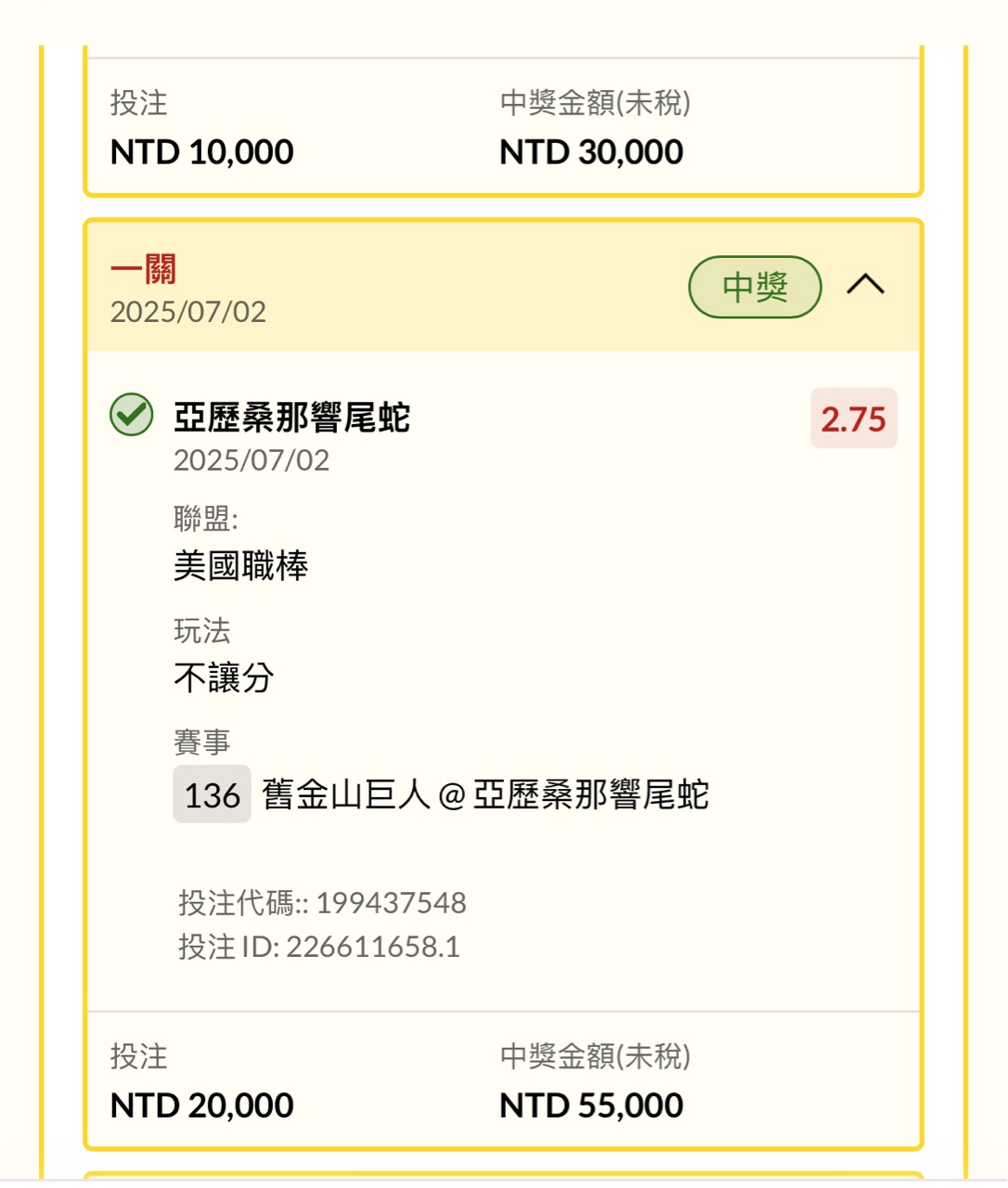 推 howardnikolo: 拼了啦重注蛇不讓3倍、2.75倍各一張 42.79.181.131 07/02 10:15