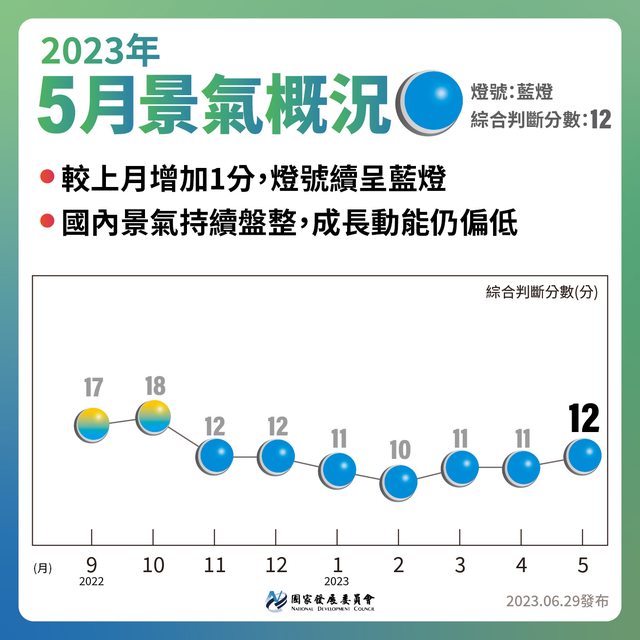 國發會 https://www.ndc.gov.tw/nc_14813_37077 112年5月景氣燈號 藍燈 (標題有一顆藍燈,我盡力用ASCII模擬unicode emoji了) https://i.imgur.com/U9Aokxm.jpg