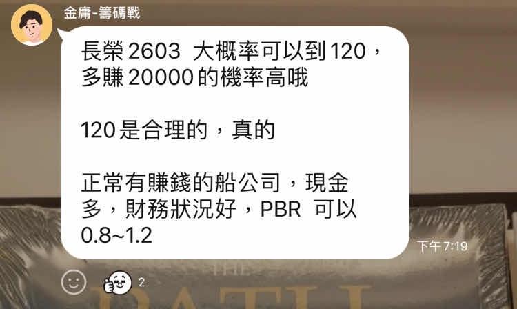 長榮2603 99.999%概率可以到120$ 120$是合理的,真的很容易到 正常有賺錢的船公司,現金多,財務狀況好,PBR 可以0.8~1.2 查了長榮歷史 股淨值比在虧錢時最低都會有0.6 對了 下半年第三季跟第四季是傳統旺季 俄羅斯戰爭看起來也要在下半年結束 到時候運量爆發力道強勁 股淨值就會往1邁進 也就是200$附近 再來更好的狀況會繼續漲上去可不止股淨比1而會在上升喔! 這種送分操作 更看到周五盤後巨額成交 竟然買漲停價位收長榮 我只能說 長榮航運在兩位數根本便宜到爆買就對了! 附上長榮2603 買在92.3的成交單 https://i.imgur.com/0IhodwE.jpg