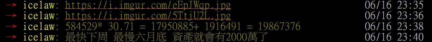 icelaw : 我的資產從6/16到7/1 剛半個月,增加了82萬台幣 07/02 19:20
