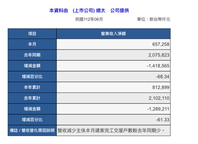 1. 標題:3056 總太 6月營收
