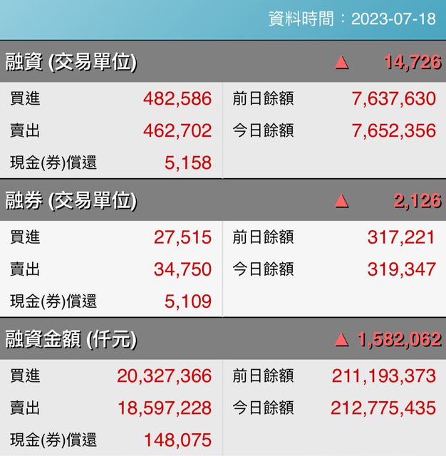 1. 標題:112年07月18日信用交易統計 2. 來源:臺灣證券交易所、證券櫃檯買賣中心 (公司名、網站名) 3. 網址:https://reurl.cc/E2xlzv https://reurl.cc/V3AOXA (請善用縮網址工具) 4. 內文: 112年07月18日信用交易統計 項目 買進 賣出 現金(券)償還 前日餘額 今日餘額 融資(交易單位) 482,586 462,702 5,158 7,637,630 7,652,356 融券(交易單位) 27,515 34,750 5,109 317,221 319,347 融資金額(仟元) 20,327,366 18,597,228 148,075 211,193,373 212,775,435 https://i.imgur.com/9l5ntQT.jpg