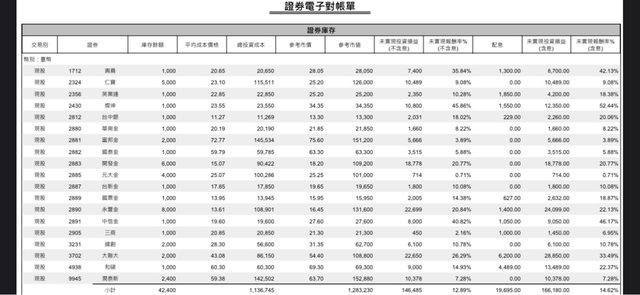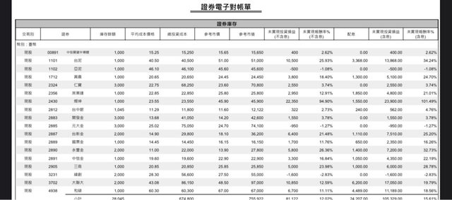 2020-2021,股市12197-8523-14732 疫情黑天鵝+中期大反彈 將原先要償還學貸的錢開始投入,接著每月不定期不定額投入,主要分成幾大類,傳產型 (台泥、亞泥、統一、興農、遠東新),金融股(華南金、開發金、元大金、台新金、永豐 金、中信金),再來是加入電子五哥(仁寶、英業達、緯創、和碩)、其他(大聯大、燦坤) ...等等 核心持股算是金融股吧,其他以高股息個股為主 會買這麼多標的,起初是想著分散風險,領股東紀念品 (像是買到19元的中信金)這沒有 誰對誰錯,自己開心能持續下去最重要 https://i.imgur.com/qNKCFw6.jpg