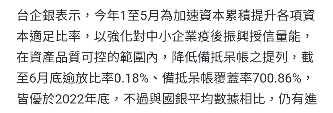 sospeter : 預提呆帳準備金,80-90%的金額中小企業保基金可回沖 08/10 15:48