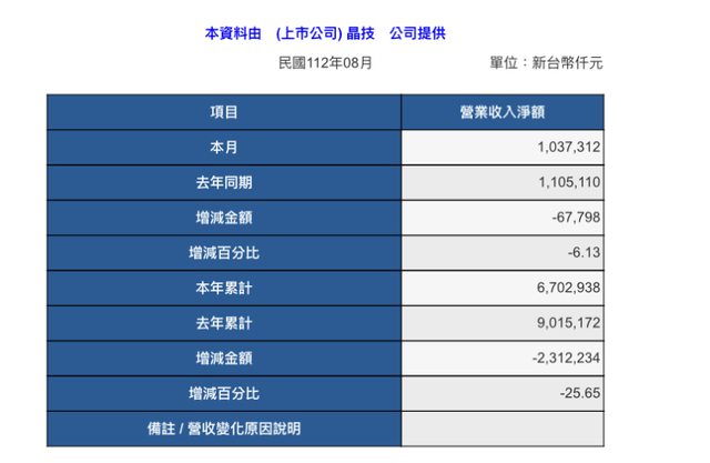 本資料由 (上市公司) 晶技 公司提供 民國112年08月 單位:新台幣仟元 項目 營業收入淨額 本月 1,037,312 去年同期 1,105,110 增減金額 -67,798 增減百分比 -6.13 本年累計 6,702,938 去年累計 9,015,172 增減金額 -2,312,234 增減百分比 -25.65 備註 / 營收變化原因說明 -- ※ 發信站: 批踢踢實業坊(ptt-site.org.tw), 來自: 114.136.215.47 (臺灣) ※ 文章網址: https://ptt-site.org.tw/Stock/M.1693929159.A.A85