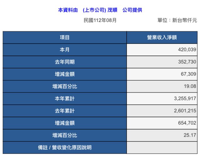 標題[情報] 9942 茂順 112年8月營收