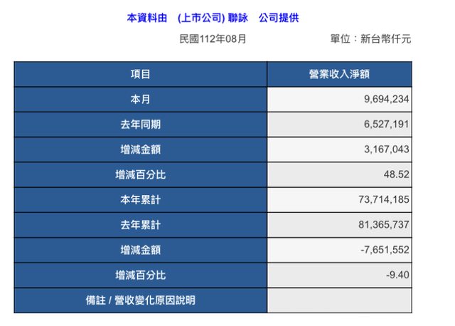 本資料由 (上市公司) 聯詠 公司提供 民國112年08月 單位:新台幣仟元 項目 營業收入淨額 本月 9,694,234 去年同期 6,527,191 增減金額 3,167,043 增減百分比 48.52 本年累計 73,714,185 去年累計 81,365,737 增減金額 -7,651,552 增減百分比 -9.40 備註 / 營收變化原因說明 -- ※ 發信站: 批踢踢實業坊(ptt-site.org.tw), 來自: 114.136.215.47 (臺灣) ※ 文章網址: https://ptt-site.org.tw/Stock/M.1693983515.A.A48