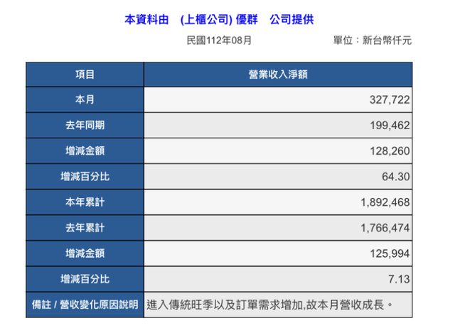 本資料由 (上櫃公司) 優群 公司提供 民國112年08月 單位:新台幣仟元 項目 營業收入淨額 本月 327,722 去年同期 199,462 增減金額 128,260 增減百分比 64.30 本年累計 1,892,468 去年累計 1,766,474 增減金額 125,994 增減百分比 7.13 備註 / 營收變化原因說明 進入傳統旺季以及訂單需求增加,故本月營收成長。 -- ※ 發信站: 批踢踢實業坊(ptt-site.org.tw), 來自: 114.136.215.47 (臺灣) ※ 文章網址: https://ptt-site.org.tw/Stock/M.1693983870.A.E61