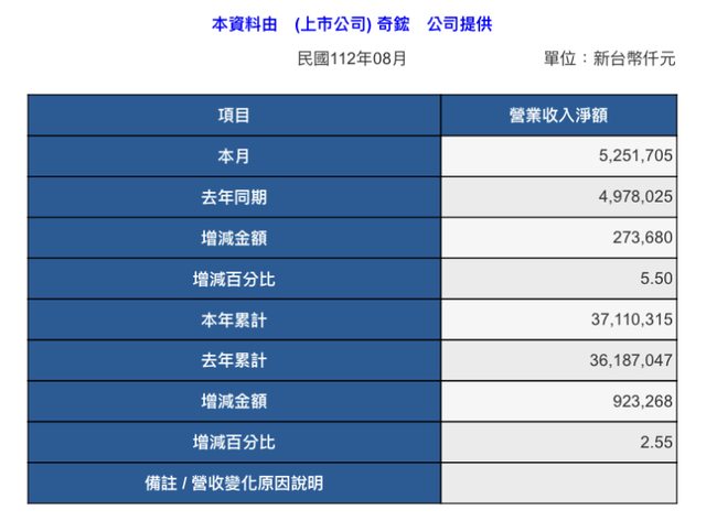 本資料由 (上市公司) 奇鋐 公司提供 民國112年08月 單位:新台幣仟元 項目 營業收入淨額 本月 5,251,705 去年同期 4,978,025 增減金額 273,680 增減百分比 5.50 本年累計 37,110,315 去年累計 36,187,047 增減金額 923,268 增減百分比 2.55 備註 / 營收變化原因說明 -- ※ 發信站: 批踢踢實業坊(ptt-site.org.tw), 來自: 114.136.254.102 (臺灣) ※ 文章網址: https://ptt-site.org.tw/Stock/M.1694085980.A.3D7