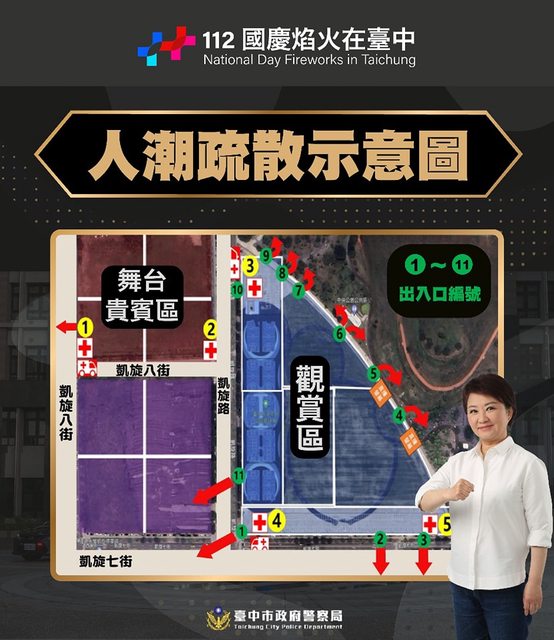 的地點,市長盧秀燕說,國慶焰火在台中,首創無人機搭載焰火施放,更將在天際排出台中